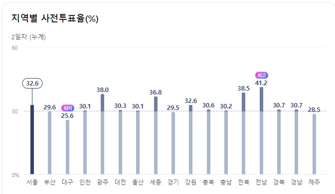 이번 사전투표에서는 지역별로 투표율에 큰 차이를 보였습니다. 투표율이 가장 높은 지역은 전남으로, 무려 41.19%를 기록했습니다. 이는 전체 투표율 중 가장 높은 수치로, 전북(38.46%), 광주(38.00%), 세종(36.80%)이 뒤를 이었습니다. 반면, 투표율이 가장 낮은 지역은 대구로 25.60%에 그쳤으며, 제주(28.50%), 경기(29.54%), 부산(29.57%) 등의 순이었습니다.
