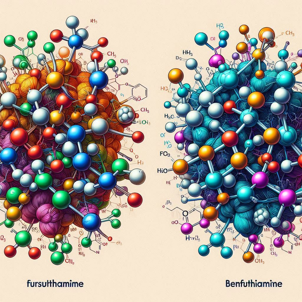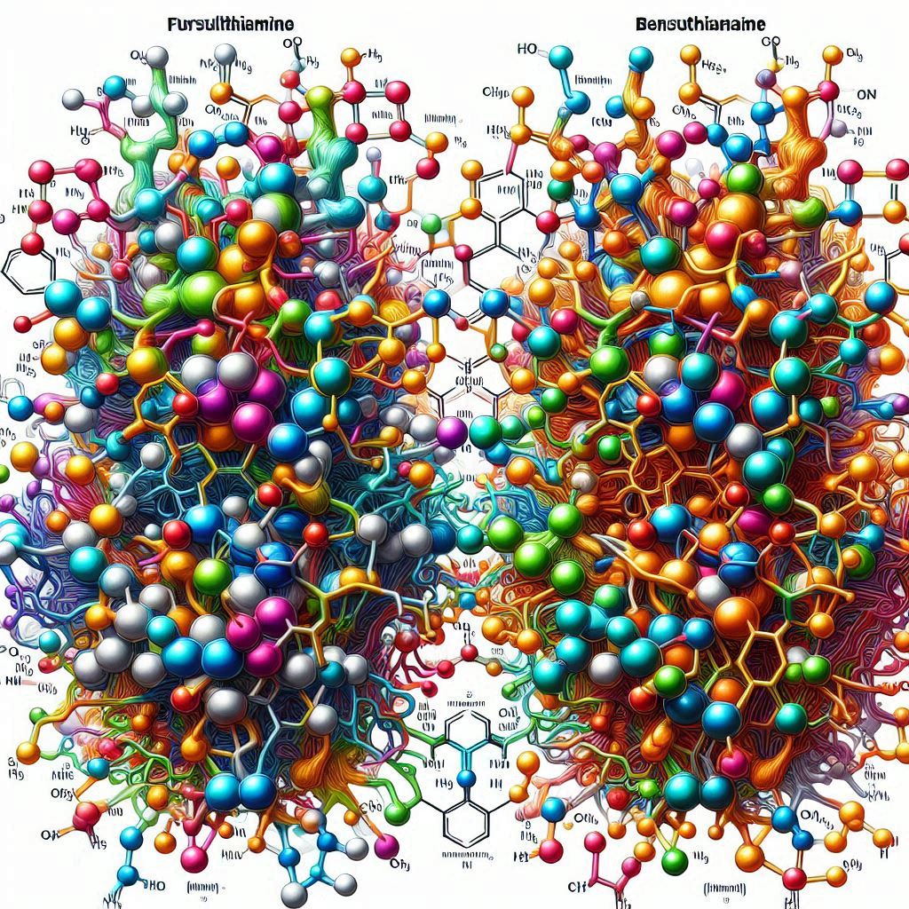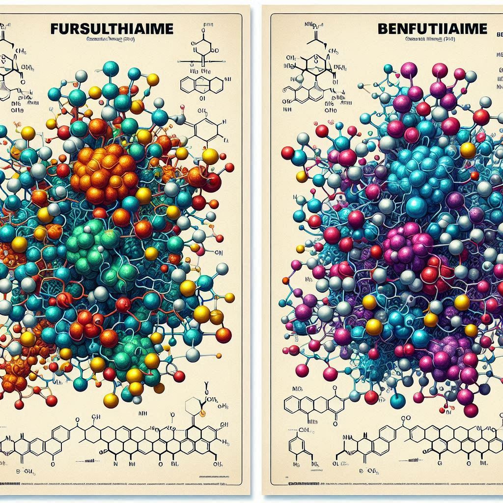 푸르설티아민은 티아민에 이황화 결합을 가진 지용성 분자로, 지방 막을 쉽게 통과하여 체내에 흡수됩니다. 이러한 구조의 특성은 푸르설티아민이 신체, 특히 신경계에 신속하게 도달할 수 있도록 돕습니다. 반면 벤포티아민은 열린 탄소 고리를 가진 유일한 티아민 유도체로 손꼽히며, 지용성이지만 푸르설티아민보다는 다소 낮은 지용성을 갖습니다.